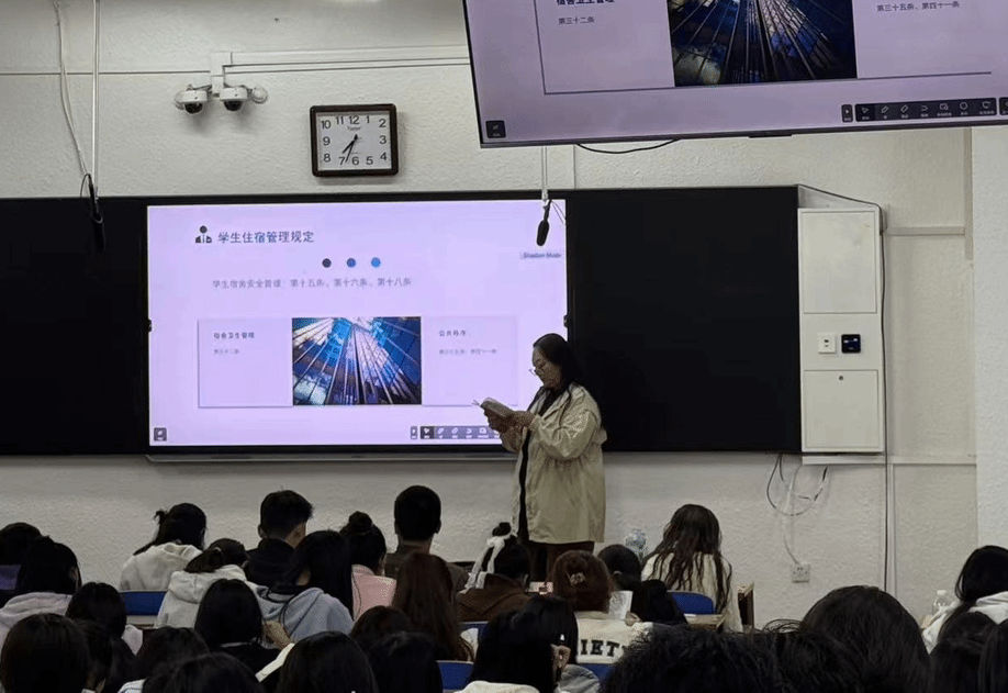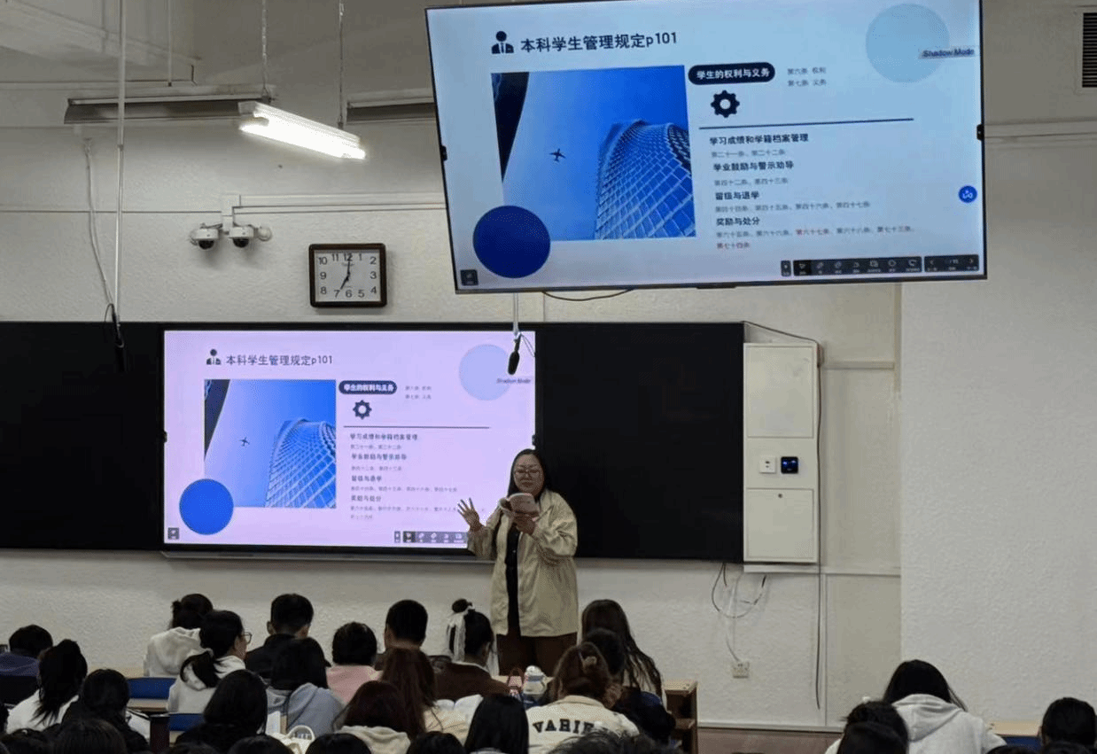 陈薇薇老师结合实际案例,从学籍管理到奖惩制度,从校园安全、住宿管理到文明礼仪,老师耐心地为学生们答疑解惑,使学生们对学校的管理有了更清晰的认识。