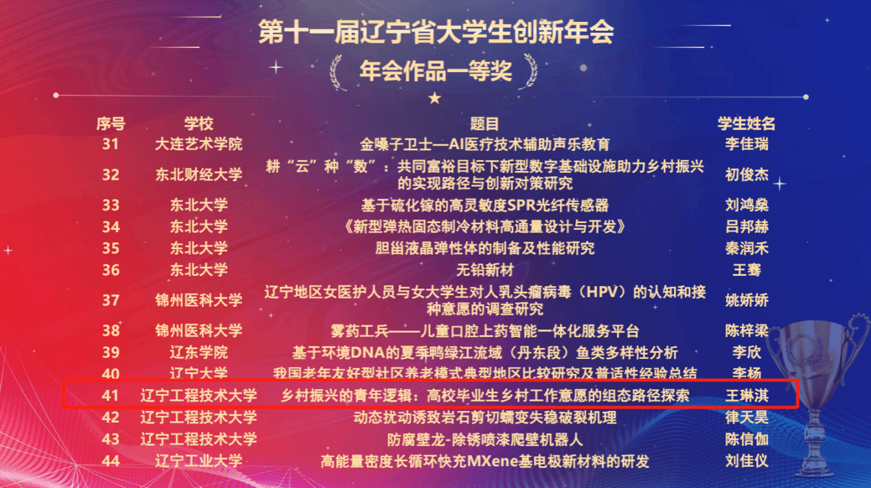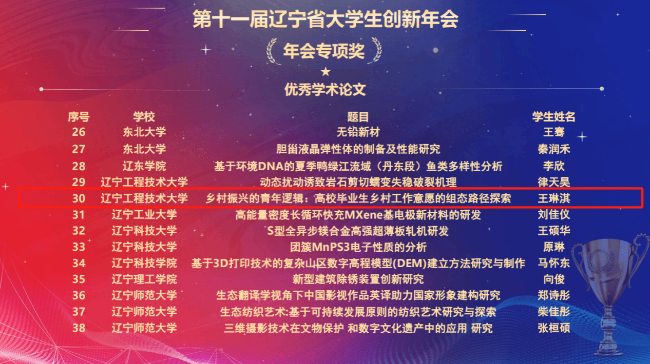 王琳淇同学及团队成员依托辽宁省大学生创新创业训练项目,作为主持人自主开展科研研究,该生在主持该大创项目过程中的另一篇学术成果《乡村振兴的青年逻辑:高校毕业生乡村工作意愿的组态路径探索》入选第十届辽宁省大学生创新年会,获得优秀学术论文奖(全校仅2项,人文社科类仅1项),作品获一等奖(全校仅3项)。