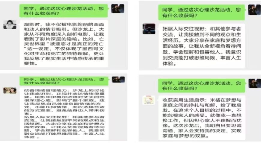 观影结束后,沙龙进入交流讨论环节。陈薇薇老师引导同学们从心理学角度分析影片中的人物性格、家庭关系和成长历程。同学们纷纷踊跃发言,结合自己的成长经历和梦想追求,分享对影片的独特见解。有的同学讲述了自己在梦想与家庭期望之间的徘徊与挣扎,有的则分享了从影片中获得的关于亲情、爱情和友情的感悟。互动过程中,大家相互倾听、彼此启发,碰撞出思想的火花,学生收获满满。