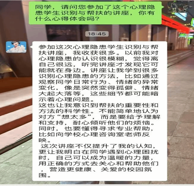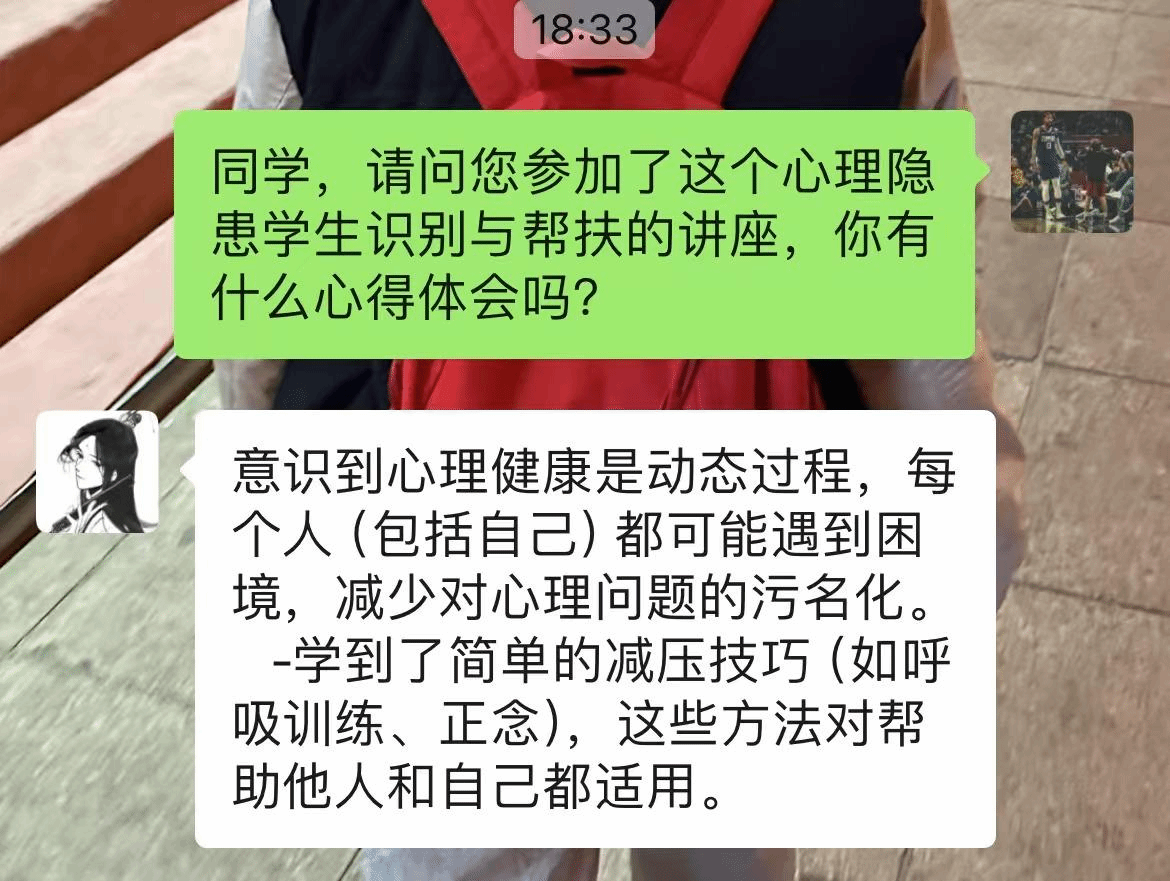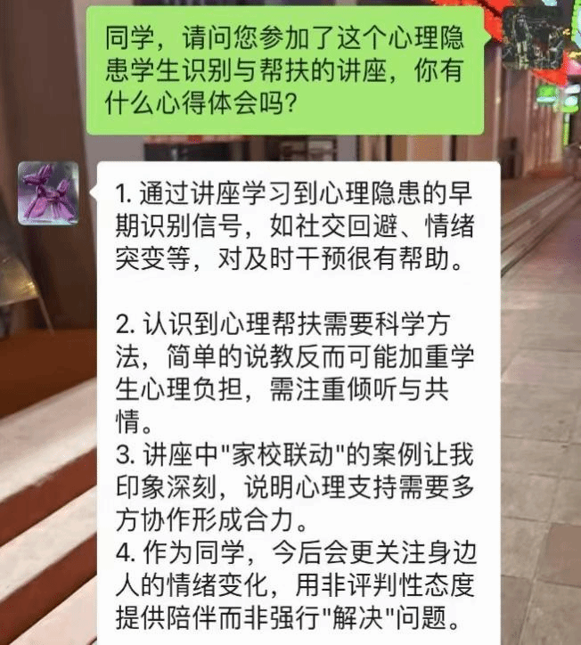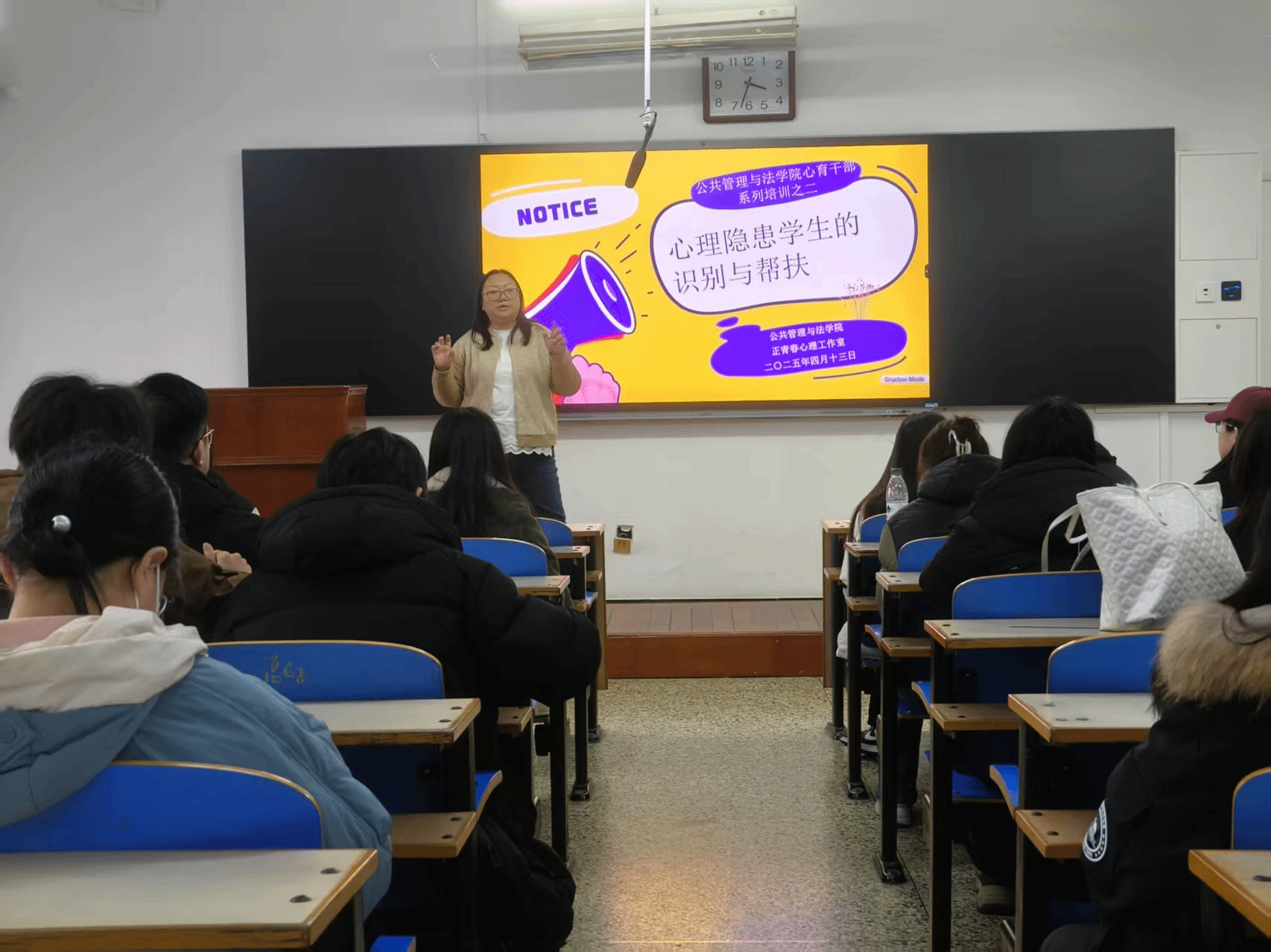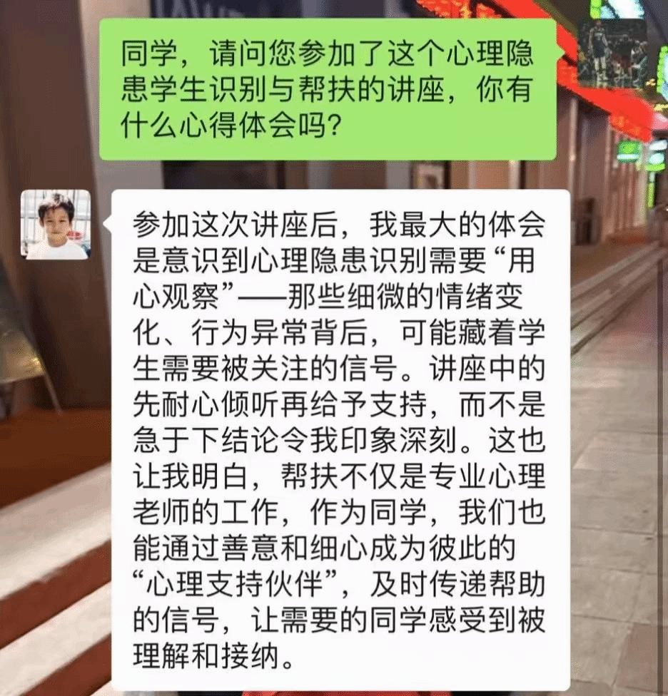 的心理健康教育的工作体系,之后围绕“心理隐患排查的重点人群”展开讲解,详细列举了需重点关注的学生类型,包括已确诊严重身心疾病、人格缺陷、缺少社会支持、经历重大事件等群体。她结合真实案例,强调通过日常观察和沟通及时发现潜在风险的重要性。