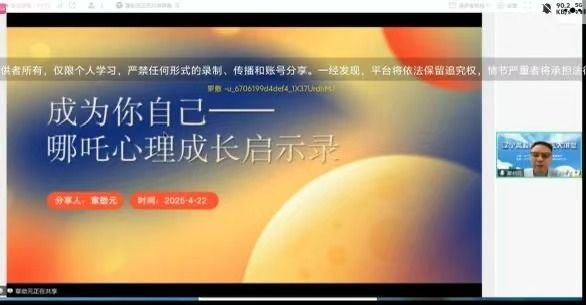 组织所有在校同学收看华中科技大学心理健康教育中心主任章劲元主讲的以“成为你自己——哪吒心理成长启示录”为独特主题的心理讲座。