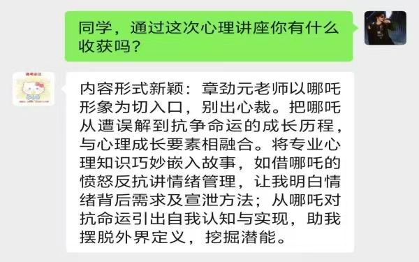 面对“如何平衡他人期待与自我追求”“社交焦虑场景下的心理调适方法”等现实困惑,章教授结合哪吒故事与心理学实证研究,给出兼具理论深度与实操性的解答。屏幕互动区弹幕不断,“原来神话故事里藏着这么多心理学智慧”“被哪吒的成长史狠狠共情了”等留言刷屏,充分展现讲座的感染力与共鸣度。