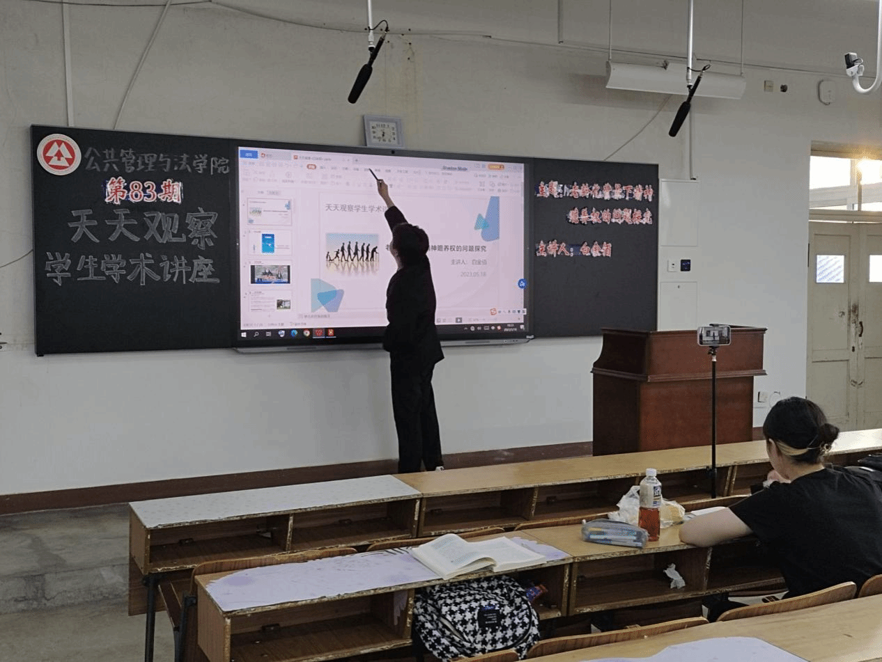 将于5月18日(周四)18:30在新华楼302教室举办本学期第二场“天天观察学生学术讲座”,本期讲座由白金佰同学带来主题为老龄化背景下精神赡养权的问题探究的精彩讲解。
