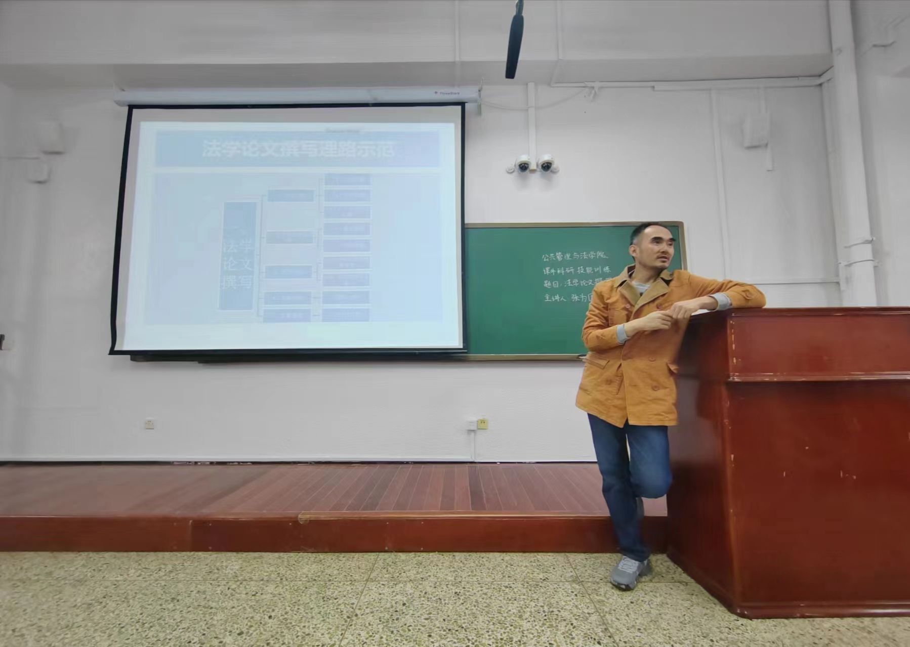 张为国老师分别从研究对象、如何发现研究对象、研究方法、文章结构、文章规范这五个方面进行阐述,并结合自己的亲身经历和在研课题将法学论文撰写方法清晰地呈现在同学们面前,耐心传授经验,让同学们对于如何进行论文撰写这个问题有了更加深刻地理解。整节课程张老师讲解幽默风趣,同学们全神贯注,学习氛围浓厚。